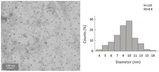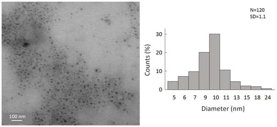 In the case of the substitution reaction with the ligand source KFeCp(CO)2, it gives a dark red-colored reaction solution and increases the stability of the nanoparticles as well [43]. Consequently, analysis via STEM was possible this time, whereby the STEM images of cyclopentadienyliron dicarbonyl-terminated germanium nanoparticles showed, again, nanoparticles with a small agglomeration and a narrow size distribution (Figure 5). Additionally, EDX measurement of the particles (Table S2, Supplementary Materials) showed a lower halide content, hence, now, a nearly quantitative substitution of the halide atoms had taken place.
