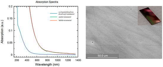 In addition to all previously mentioned applications of germanium nanoparticles, the interest in Ge thin film stems from the fact that Ge nanoparticles are used in thermal imaging, photodetectors, photovoltaic systems, and various other applications, such as solar cells, etc. [47,48,49,50,51]. Moreover, the use of relatively simple experimental equipment to create a Ge thin film allows one to obtain, study, and tailor their properties at a surprisingly low cost. However, this is challenging due to multiple issues such as strained films or high surface roughness, and there has been a lot of effort to grow high-quality thin films incorporating Germanium on Si substrates [52,53,54,55,56]. In this respect, different thin film samples of halide-terminated, amide-terminated, and cyclopentadienyliron dicarbonyl-terminated germanium nanoparticles were prepared by spin coating in an Ar-filled glovebox. The ability to form a thin film definitely opens the door to a new area of applications of these germanium nanoparticles and a promising route to improve the understanding of the properties of such synthesized nanoparticles. The SEM pictures directly show strong differences in the obtained films. In the case of the halide-terminated nanoparticles (Figure 7), a closed smooth film was obtained. In the case of the amide- and the cyclopentadienyliron dicarbonyl-terminated germanium nanoparticles, less perfect films with holes were obtained (Figure S5, Supplementary Materials). Considering the fact that there was a different color of the thin films, we checked the optical properties of the as-prepared films, which showed like the particles (Figure S3, Supplementary Materials) differences in the absorption spectra, depending on the surface termination.