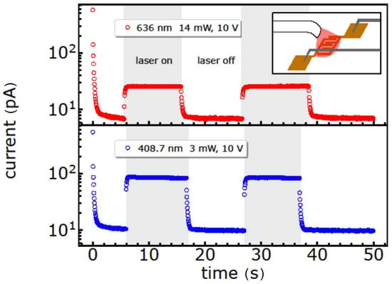 The prepared photodetector devices were transferred in a Lake Shore Cryotronics probe station CRX-6.5K under N2 via a home-built transfer arm to avoid contact with air. The optoelectronic investigations were performed in this probe station under a pressure of 2 × 10−6 mbar with a Keithley 2634B System Source Meter at room temperature. The electrodes were contacted with 50 Ω impedance-matched tungsten two-point probes. The photocurrent was measured under continuous wave illumination of the devices using a 636 nm laser (Taiko PDL M1, LDH-IB-640-B, PicoQuant; Berlin, Germany) and a 408.7 nm laser (LDC210C + TED200C, LP405-SF10, Thorlabs; Newton, NJ, USA). The powers of 14 mW and 3 mW were chosen as the maximum for 636 nm and 408.7 nm laser illumination, respectively. The laser spot was not focused in order to illuminate the whole electrode area.