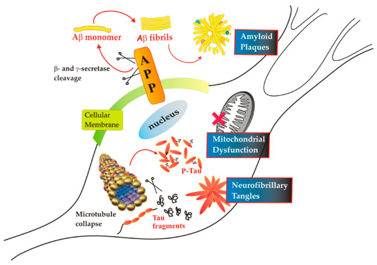 «Ich habe mich verloren»—translated from German «I lost myself»—are the few words that Auguste Deter obsessively repeated when Dr. Alois Alzheimer, who was treating her, asked her to write her name. From a careful post-mortem examination of Auguste’s brain, alterations typical of the disease that afflicting the woman were found, i.e., intra- and extracellular accumulations of protein material. These accumulations interfere with the functioning of individual neurons, inducing cellular suffering and loss of synapses, and subsequently, neuronal death. They are the most distinctive diagnostic features of Alzheimer’s disease (AD), the identity of which remained unknown until the mid-eighties. The so-called amyloid plaques, i.e., accumulations of β-amyloid (Aβ) protein outside neurons, are clumps that form between neurons and damage surrounding cells, while tangles of abnormally modified Tau protein inside cells block communication between nerve cells [1] (Figure 1).