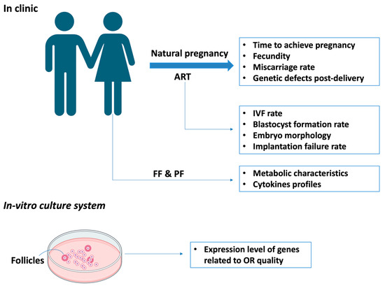 The limited pool theory postulates that quantitative reduction in OR may lead to a decline in the quality, characterized by impaired oocyte development and decreased oocyte quality [44]. The natural fertility of women and the successful rate of assisted reproductive technologies (ART) can reflect OR, including time to achieve pregnancy, fecundity, miscarriage rate, and genetic defects post-delivery [43,60]; whilst, in ART, in-vitro fertilization (IVF) rate, blastocyst formation, embryo morphology, and implantation failure rate can reflect OR qualitatively. Oocyte and embryo quality are considered more likely to be indicated by pregnancy rate and live birth rate [61,62].