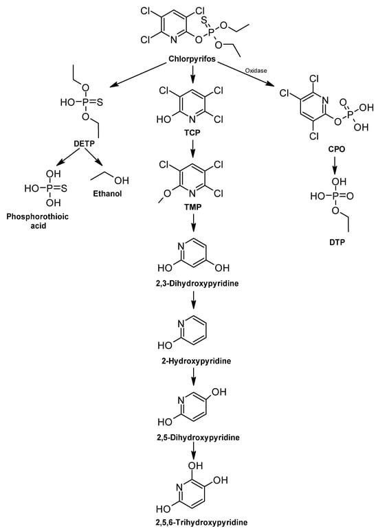 - Huang, Y.; Zhang, W.; Pang, S.; Chen, J.; Bhatt, P.; Mishra, S.; Chen, S. Insights into the Microbial Degradation and Catalytic Mechanisms of Chlorpyrifos. Environ. Res. 2021, 194, 110660. [Google Scholar] [CrossRef]
