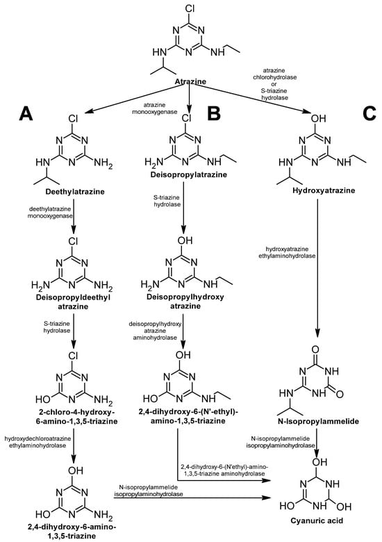 - Rajendran, K.; Pujari, L.; Ethiraj, K. Biodegradation and Bioremediation of S-Triazine Herbicides. In Environmental Biotechnology Vol. 3; Gothandam, K.M., Ranjan, S., Dasgupta, N., Lichtfouse, E., Eds.; Environmental Chemistry for a Sustainable World; Springer International Publishing: Cham, Switzerland, 2021; Volume 50, pp. 31–54. ISBN 978-3-030-48972-4. [Google Scholar]