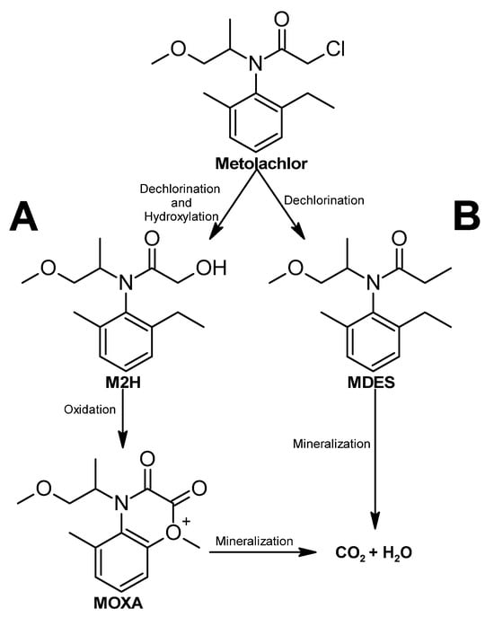 - Liu, S.Y.; Freyer, A.J.; Bollag, J.M. Microbial Dechlorination of the Herbicide Metolachlor. J. Agric. Food Chem. 1991, 39, 631–636. [Google Scholar] [CrossRef]