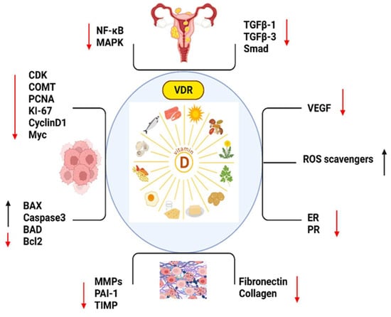 The important markers which play roles in vitamin D such as, NF-KB: Nuclear Factor-Kappa B; MAPK: Mitogen-Activated Protein Kinase; TGFB1: Transforming Growth Factor Beta 1; TGFB3: Transforming Growth Factor Beta 3; SMAD: Mothers Against Decapentaplegic (SMAD is a family of proteins); CDK: Cyclin-Dependent Kinase; COMT: Catechol-O-Methyltransferase; PCNA: Proliferating Cell Nuclear Antigen; KI-67: Antigen KI-67 (also known as MKI67); CYCLIN D1: Cyclin D1; MYC: Myelocytomatosis Oncogene; BAX: Bcl-2 Associated X Protein; CASPASE 3: Caspase 3; BAD: Bcl-2 Associated Death Promoter; BCL2: B-Cell Lymphoma 2; MMPS: Matrix Metalloproteinases (MMPS is a family of proteins); PAI-2: Plasminogen Activator Inhibitor-2; TIMP: Tissue Inhibitor of Metalloproteinases (TIMP is a family of proteins); FIBRONECTIN: Fibronectin; COLLAGEN: Collagen; VEGF: Vascular Endothelial Growth Factor; ROS SCAVENGERS: Reactive Oxygen Species Scavengers; ER: Estrogen Receptor and PR: Progesterone Receptor. (Red arrow: decreased expression, black arrow: increased expression.)
