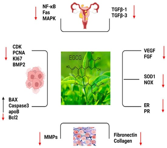 The important markers which play roles in EGCG such as, NF-KB: Nuclear Factor-Kappa B; Fas; Fas cell surface death receptor; MAPK: Mitogen-Activated Protein Kinase; TGFB1: Trans-forming Growth Factor Beta 1; TGFB3: Transforming Growth Factor Beta 3; CDK: Cy-clin-Dependent Kinase; PCNA: Proliferating Cell Nuclear Antigen; KI-67: Antigen KI-67 (also known as MKI67); BMP2: Bone Morphogenetic Protein 2; BAX: Bcl-2 Associated X Protein; CASPASE 3: Caspase 3; apoB: Apolipoprotein B; BCL2: B-Cell Lymphoma 2; MMPS: Matrix Metalloproteinases (MMPS is a family of proteins); FIBRONECTIN: Fibronectin; COLLAGEN: Collagen; VEGF: Vascular Endothelial Growth Factor; FGF: Fibroblast Growth Factor; SOD1: Superoxide Dismutase 1; NOX: NADPH Oxidase; ER: Estrogen Receptor and PR: Progesterone Receptor (Red arrow: decreased expression, black arrow: increased expression.).