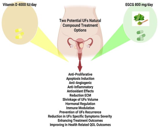 Clinical trials investigating the safety and efficacy of EGCG as an anti-UFs treatment have reported significant decreases in UFs volume, improvements in UFs symptoms, and enhanced healthrelated QOL scores compared to control groups. However, further research with larger cohorts and randomized controlled trial designs is necessary to assess the clinical effects and potential side effects of vitamin D and EGCG supplementation, either alone or in combination, for managing UFs, especially in women approaching late reproductive life when hormonal manipulation may not be suitable.
