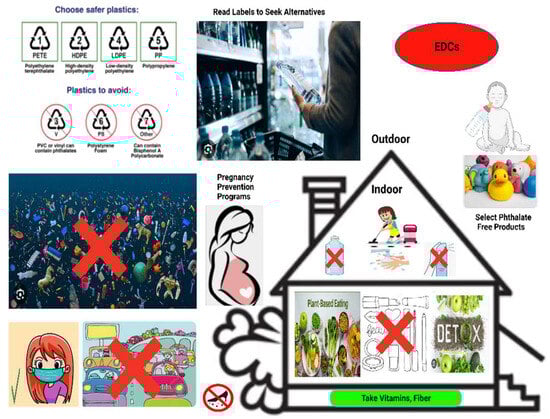 Simple but important considerations to avoid endocrine-disrupting chemical (EDC)-containing products, such as using phthalate-free products, reading labels to seek alternatives, reducing the use of plastic containers, avoiding traffics jam, removing shoes before entering the home, reducing the use of beauty and cosmetic products like nail polish, avoiding water plastic bottle and air freshener, staying hydrated with filtered water, wearing mask, including detox foods, adopting a plant-based diet intake, consuming fruits with vitamins and fiber content, dusting and vacuuming often with a high-efficiency particulate absorbing filter (HEPA)-filtered vacuum, choosing fresh whole foods over processed ones.