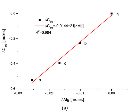 The relationships that are seen in the changes in Ca contents resemble the information in Figure 1 for changes in Mg. The change in organic carbon contents is clearly paraboloidal, with an impressive coefficient of determination, R2, which was close to 1. Even more indicative is the relationship between growth in Ca contents and the decline in water concentration in the bioapatite. This dependence is linear, with an R2 near 1. Both dependencies are negatively correlated, contrary to the situation with Mg. The connection between the enrichment in Cl and the growth in Ca contents is very clear and of paraboloidal character; however, the connection if somewhat less strict than in the case of Mg.