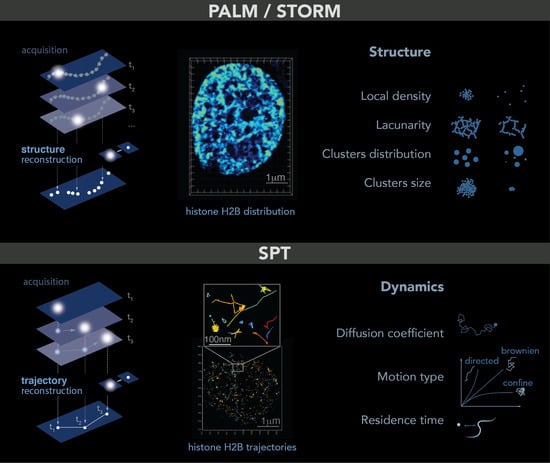 PALM and SPT: Principle, example and observables. Top: PALM/STORM principles. Left: a sparse subset of fluorescent probes is activated to produce single-particle images (represented by white circles) that do not overlap (left). After acquisition of images at a given time interval (t), a super-resolution image is reconstructed by plotting the measured positions of the fluorescent probes. Middle: example of histone H2B-mEOS distribution within a cell nucleus. (Right): further analysis of the final reconstructed images provides several parameters of the structure formed by the observed protein. Bottom: principle of SPT. (Left): during image acquisition, images are taken with a given exposure time (t) for the duration of several minutes. In each image, only a sparse number of emitters (white dots) are detected. Middle: using tracking and localization methods, it is possible to reconstruct the super-resolved trajectories of single molecules. Each histone H2B trajectory is represented within a cell nucleus by a colored trace. Right: different dynamic parameters can be extracted from SPT data by using mathematical approaches. (Image by Olga Markova).
