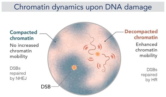 So far, we have reviewed the organization and dynamics of chromatin in its physiological state. In the last section, we focus on the behavior of chromatin when it undergoes damage. In fact, DNA is continuously threatened by endogenous and exogenous factors that can result in different types of lesions, double strand breaks (DSBs) being the most detrimental. A network of cellular mechanisms, named together the DNA damage response (DDR), monitor DNA lesions, guarantee faithful repair and, therefore, chromosome stability. Two of the most well-known DSB repair mechanisms are homologous recombination (HR) and non-homologous end joining (NHEJ). While HR repairs DNA breaks by copying the missing information across the lesion from an undamaged template, as from the replicated sister chromatid, NHEJ does it by ligation of the broken ends after their juxtaposition (reviewed in [110,111,112,113]).
