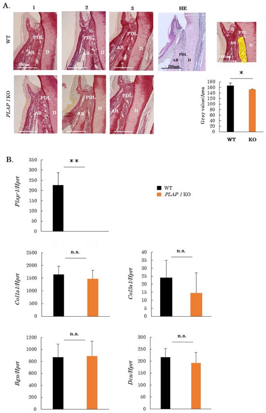 To observe the collagen fiber bundles comprising the PDL, thin sections of maxillary periodontal tissue from 10-week-old male WT and PLAP-1 KO mice were prepared and subjected to picrosirius red staining (Figure 2A). The density of the collagen fiber bundles in the PDL of PLAP-1 KO mice was observed to be reduced compared with that of WT mice. We assessed the sparseness of periodontal fiber bundles in the proximal region of the first molar, excluding vessels with a diameter of 20 µm or more (Figure 2A, yellow region). The results showed a significant decrease in the density of collagen fiber bundles in the PDL of PLAP-1 KO mice compared with WT mice (Figure 2A).