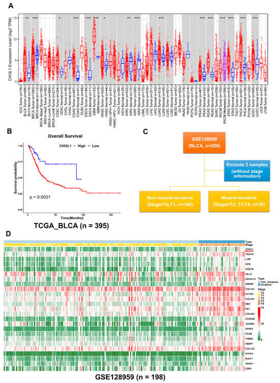 CHI3L1 overexpression is associated with poor prognosis and invasive BLCA patients. (A) The CHI3L1 level in different cancer types from the TCGA database in TIMER (red: tumor; blue: normal) (* p < 0.05, ** p < 0.005, *** p < 0.001). (B) Kaplan–Meier method was used to examine OS in patients with BLCA in TCGA (p = 0.0031). (C) The analyzed diagram of the GSE128959 dataset. (D) Heatmap of significant differentially expressed genes in the non-invasive group and invasive group of the GSE128959 dataset.