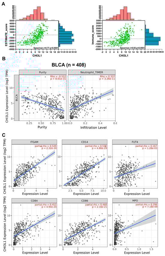 Previous studies have demonstrated that the neutrophil-to-lymphocyte ratio and baseline neutrophil count are associated with the prognosis of patients with MIBC undergoing chemoradiation treatment [23,24]. Furthermore, activated neutrophils have been observed to suppress liver inflammation by secreting CHI3L1 [22]. Moreover, CHI3L1 is involved in the creation of an immuno-suppressive tumor microenvironment. Therefore, in this study, we examined the association between CHI3L1 expression and immune cell infiltration, particularly neutrophil infiltration, in patients with bladder cancer by using the ESTIMATE algorithm and TIMER algorithm. According to the result of the ESTIMATE algorithm, CHI3L1 expression was positively correlated with the ESTIMATE score (r = 0.77, p < 0.0001) and the Immune score (r = 0.65, p < 0.0001; Figure 2A). In addition, CHI3L1 expression displayed a negative correlation with tumor purity (Rho = −0.552, p = 8.01 × 10−31) but a significant positive correlation with neutrophil infiltration (Rho = 0.337, p = 3.26 × 10−11; Figure 2B). In addition to using the TIMER algorithms, we also employed the CIBERSORT and CIBERSORT-ABS algorithms to further validate the relationship between CHI3L1 and neutrophil infiltration. Supplementary Figure S2A illustrates that CHI3L1 expression was positively correlated with neutrophil infiltration. In addition to neutrophils, we further investigated the correlation between CHI3L1 and other immune cells including CD4+ T cells, CD8+ T cells, macrophages, and dendritic cells (Supplementary Figure S2B). We observed that the positive correlation also existed in CHI3L1 and other immune cells. Furthermore, we analyzed the relationship between CHI3L1 expression and neutrophil-associated markers contributing to cancer progression [25,26,27]. The results revealed significant positive correlations between CHI3L1 expression and the immunosuppression-related neutrophil markers CD11b (ITGAM), CD84, and CD86. In addition, CHI3L1 expression was positively correlated with the neutrophil markers CD14, CD15 (FUT4), and MPO, which promote tumor cell invasion and proliferation (Figure 2C). In summary, the elevated expression of CHI3L1 in BLCA is related with protumor neutrophil infiltration.