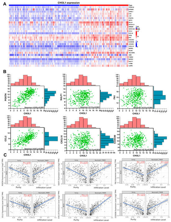 CHI3L1-related genes are correlated with neutrophil infiltration in BLCA. (A) Heatmap of significant differentially expressed genes in the high-level and low-level CHI3L1 groups from the GSE128959 dataset. (B) The correlation between CHI3L1 and differentially expressed genes (POSTN, SULF1, FN1, CCL2, CXCL10, and CCDC80). (C) The correlation between CHI3L1-related genes (POSTN, SULF1, FN1, CCL2, CXCL10, and CCDC80) expression and neutrophil infiltration.