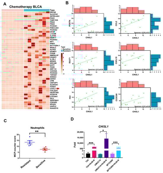 Patients with chemotherapy resistant bladder cancer exhibit a high level of CHI3L1 expression and neutrophil infiltration. (A) Heatmap of up-regulated differentially expressed genes in the chemotherapy-sensitive and chemotherapy-resistant groups. (B) The correlation between CHI3L1-related genes (POSTN, SULF1, FN1, CCL2, CXCL10, and CCDC80) and CHI3L1 expression in the chemotherapy BLCA cohort. (C) The neutrophil count was compared between chemotherapy-resistant and chemotherapy-sensitive patients (** p < 0.01). (D) The differences of CHI3L1 mRNA expression while bladder cancer cells (T24, UMUC14, BFTC909) were co-cultured with or without HL60-N cells (* p < 0.05, *** p < 0.002).