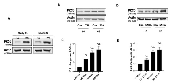 Increased expression of PKCδ seen under chronic hyperglycemic conditions is resistant to TSA or SAHA in INS-1 832/13 cells: (A) Cells were incubated (24 h) under LG or HG conditions. Expression of PKCδ in cell lysates was determined with Western blotting. Data from two studies are shown here. (B) Cells were cultured under LG or HG conditions in the presence of TSA (250 nM) or diluent (DMSO; 24 h). A representative Western blot (from 5 experiments) depicting the expression of PKCδ is provided here. (C) Densitometry analysis was conducted on PKCδ bands and the ratios of PKCδ: β-Actin are shown herein. Pooled values from the five studies are provided here. Data are expressed as mean ± SEM. * p < 0.05. a: compared with LG-Con; b: vs. LG-TSA. (D) Cells were exposed to LG or HG conditions with SAHA (100 μM) or DMSO (diluent control) for 24 h. Relative abundance of PKCδ was determined with Western blotting. A representative blot from four independent studies is shown here. (E) Combined data from four studies are shown. The results are indicated as mean ± SEM. * p < 0.05. a: compared with LG-Con; b: compared with LG-SAHA.
