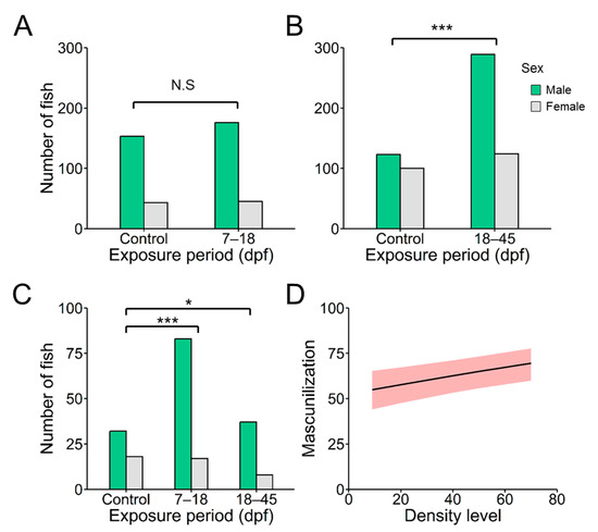 The number of males observed at different exposure windows: (A) 7–18 and (B) 18–45 days post-fertilization (dpf) at two stocking densities (9 and 66 fish/L). Sex ratio analysis between density treatments was conducted using the χ2 test. (C) The number of males observed in family #6 tested in both periods, 7–18 and 18–45 dpf. (D) The expected masculinization in the populations of zebrafish according to density level (number of fish/L) based on the prediction fit of a generalized linear mixed model for the 18–45 dpf period. The shadow represents the masculinization predicted by the model based on the rearing density. Abbreviations: N.S. = no significant; * = p < 0.05; *** = p < 0.001.