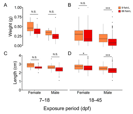 (A,B) Body mass (weight in g) and (C,D) length (cm) of females and males at different exposure windows: 7–18 and 18–45 days post-fertilization (dpf) at two stocking densities (9 fish/L and 66 fish/L). The total number of fish used was 1003; 369 (control), 221 (7–18 dpf), and 413 (18–45 dpf). Abbreviations: N.S. = no significant; * = p < 0.05; *** = p < 0.001.