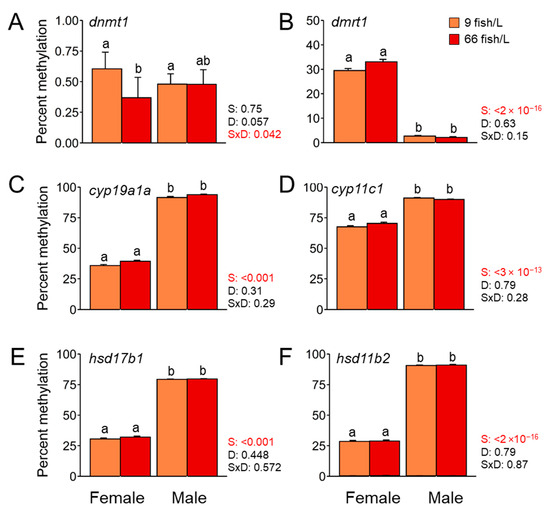 Mean DNA methylation levels in the promoter region of (A) dnmt1, (B) dmrt1, (C) cyp19a1a, (D) cyp11c1, (E) hsd17b1, and (F) hsd11b2 in mature gonads of females and males (90 days post-fertilization, dpf) exposed to two rearing densities (9 and 66 fish/L) from the 18–45 dpf group. The number of fish analysed in each group was n = 10. Two-way ANOVA followed by a post hoc Tukey test were applied. The p-values for the factor effects of sex (S), density (D), and the interaction of both factors (S × D) are reported for each gene. A robust non-parametric two-way ANOVA with trimmed means was applied when data did not follow normality. Data are shown as mean ± S.E.M. Different letters indicate significant differences (p < 0.05) between sex and/or density.
