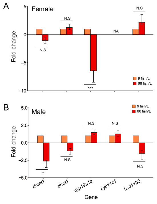 Gene expression of dnmt1, dmrt1, cyp19a1a, cyp11c1, and hsd11b2 in (A) ovaries and (B) testes 90 days post-fertilization (dpf) after the exposure to two rearing densities (9 and 66 fish/L) from 18 to 45 dpf. Data shown as mean ± SEM. Fold change values of control group (9 fish/L) was set up at 1 as reference. Sample size: n = 10 (ovaries) and n = 10 (testes) in each group. Significant differences between sexes were analyzed using the student’s t-test. Abbreviations: N.S. = no significant; * = p < 0.05; *** = p < 0.001.
