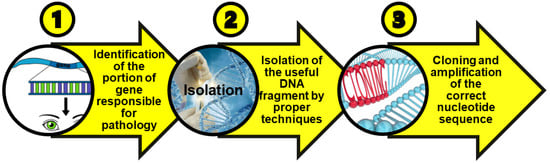To have success in gene therapy, it is necessary first to identify the portion of the gene responsible for the pathology. Subsequently, it is essential to select the more proper technique for isolating the fragment of DNA containing the information needed to synthesize the protein required for correcting the pathology. Additionally, it is basic to clone and amplify the correct nucleotide sequence [19]. Figure 1 schematically represents these mandatory steps.