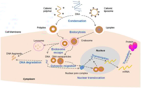 For this reason, research is currently oriented towards transferring the genetic material of interest into the cells through appropriate vectors that can compact, transport, and protect it up to the nucleus, thus preventing rapid degradation by blood nucleases [21]. Figure 2 effectively illustrates the stages of the transfection process.
