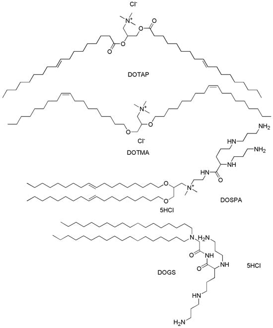 Nowadays, numerous lipid-based transfection reagents are commercially available, including N-[1-(2,3-dioleyloxy)propyl]-N,N,N-trimethylammonium chloride (DOTMA), 2,3-dioleyloxy-N-[2(carboxamidospermine)ethyl]-N,N-dimethyl-1-propanaminotrifluoroacetate (DOSPA), 1,2-dioleoyl-3-trimethylammoniumpropane (DOTAP), and dioctylamidoglycyl-spermine (DOGS) [42] (Figure 3).