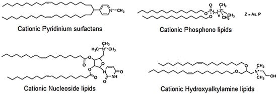 Chabaud et al. [45] attempted to improve the TE of cationic lipids in vivo by inserting uridine, thus forming a cationic lipid nucleoside (Figure 4). These lipids can interact with DNA base pairs via hydrogen bonding and π-π interactions, in addition to the typical electrostatic interactions between protonated amino groups and anionic phosphate groups of DNA [45].