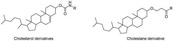 In this regard, to promote phase transformation, endosome escape, and the release of genetic material, Du et al. created cholesterol-amino-phosphate (CAP) lipids RNA delivery systems by incorporating cholesterol, phospholipids, and amines [47]. More recently, cholesterol [48,49] and other steroids [50] were used instead of aliphatic chains to evaluate the importance of the rigidity of these systems and their biodegradability. Figure 5 shows examples of cholesterol and cholestane derivatives.