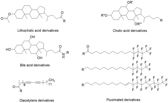 In particular, the combination of amphiphilic deoxycholic acid and cationic PAMAM resulted in macromolecules able to co-deliver doxorubicin and pDNA. Additionally, the as-prepared NPs had low cytotoxicity and could achieve a TE of up to 74% in the 293 T cells [51]. Similarly, the amphiphilic combination of bile acids, such as deoxycholic acid and the cationic polyethylene imine (PEI), efficiently transported the genetic cargo and further enhanced TE of Adenovirus (Ad) in CAR-negative cells [52]. Additionally, the Ad-PEI-bile-acid complex developed by Lee et al. showed enhanced TE and therapeutic efficacy in tumors with low coxsackie and adenovirus receptor expression [53]. Polydiacetylenic derivatives (Figure 6) with protonatable amine or imidazole groups crosslinked using UV light generated interesting structures, such as nanomicelles or nanofibers, which were suitable for plasmid RNA (pRNA) and short interfering RNA (siRNA) delivery [54]. Lipids bearing highly fluorinated alkyl chains have been successfully synthesized and have demonstrated excellent gene transfer success due to their ability to avoid interactions with hydrophilic and lipophilic biocompounds [55].