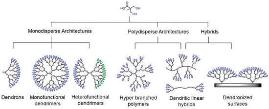 - Carlmark, A.; Malmström, E.; Malkoch, M. Dendritic Architectures Based on Bis-MPA: Functional Polymeric Scaffolds for Application-Driven Research. Chem. Soc. Rev. 2013, 42, 5858–5879. [Google Scholar] [CrossRef]