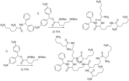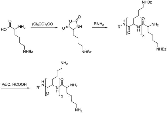 Conventionally, three approaches are applied to synthesize PLL, including solid-phase peptide synthesis (SPPS), ring-opening polymerization (ROP), and chemical-enzymatic synthesis (CES). Generally, different synthesis approaches are chosen to prepare PLLs with different structures, dispersity, and molecular weight [61]. Concerning ROP, the synthesis of PLL proceeds through the conversion of L-lysine protected on the ε amino group to the corresponding cyclic N-carboxy anhydride, which undergoes a ring-opening polymerization induced by a primary amine as an initiator. Protected PLL is then deprotected to free PLL by catalytic hydrogenation (Scheme 1).