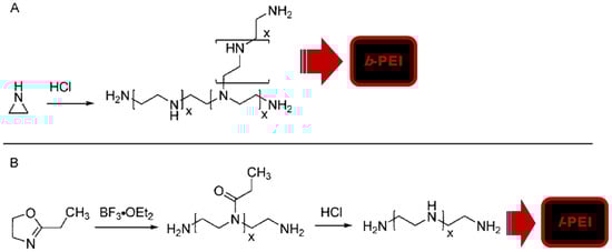 The synthesis of branched PEI (b-PEI) proceeds via the acid-catalyzed polymerization of aziridine (Scheme 2A), whereas the synthesis of linear PEI (l-PEI) is achieved via ROP of 2-ethyl-2-oxazolin, followed by acid hydrolysis (Scheme 2B) [72].