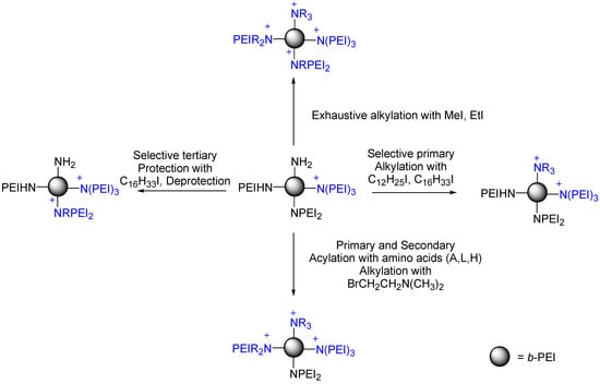 In particular, Thomas and Klibanov carried out such modifications on PEI2 and 25 KDa PEI to assess how they could affect the proton sponge capacity, the hydrophobic-hydrophilic balance, and lipophilicity [27]. Scheme 4 reports the reactions carried out by the authors to introduce quaternary groups into the polymer scaffold of PEI using methyl and ethyl iodide (Scheme 4).