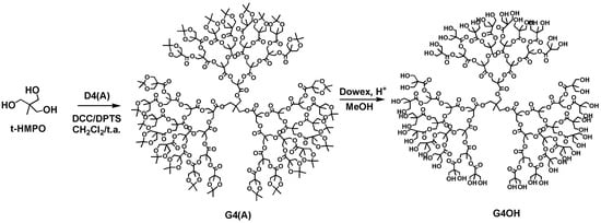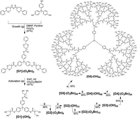 - Ihre, H.; Padilla De Jesús, O.L.; Fréchet, J.M. Fast and convenient divergent synthesis of aliphatic ester dendrimers by anhydride coupling. J. Am. Chem. Soc. 2001, 123, 5908–5917. [Google Scholar] [CrossRef]