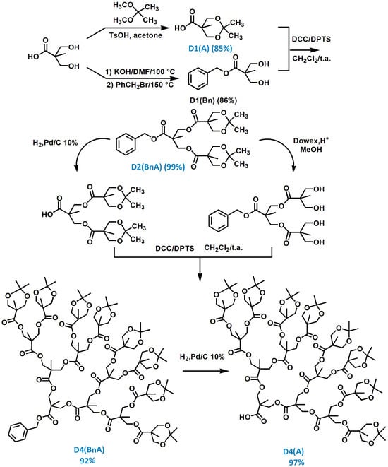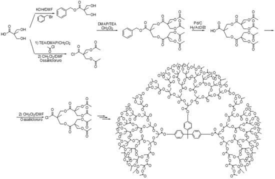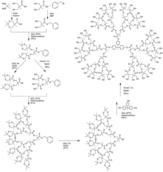 - Ihre, H.; Hult, A.; Fréchet, J.M.J.; Gitsov, I. Double-Stage Convergent Approach for the Synthesis of Functionalized Dendritic Aliphatic Polyesters Based on 2,2-Bis(Hydroxymethyl)Propionic Acid. Macromolecules 1998, 31, 4061–4068. [Google Scholar] [CrossRef]