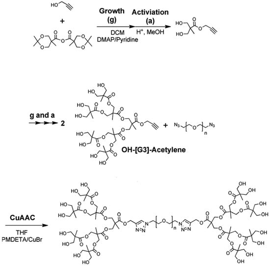 - Antoni, P.; Robb, M.J.; Campos, L.; Montanez, M.; Hult, A.; Malmström, E.; Malkoch, M.; Hawker, C.J. Pushing the Limits for Thiol−Ene and CuAAC Reactions: Synthesis of a 6th Generation Dendrimer in a Single Day. Macromolecules 2010, 43, 6625–6631. [Google Scholar] [CrossRef]
