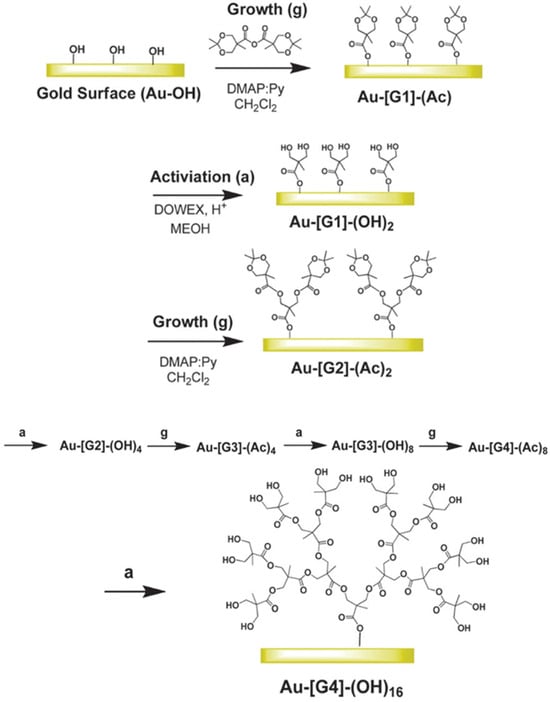 - Benhabbour, S.R.; Liu, L.; Sheardown, H.; Adronov, A. Protein Resistance of Surfaces Prepared by Chemisorption of Monothiolated Poly(Ethylene Glycol) to Gold and Dendronization with Aliphatic Polyester Dendrons: Effect of Hydrophilic Dendrons. Macromolecules 2008, 41, 2567–2576. [Google Scholar] [CrossRef]