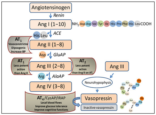 Each of the mentioned angiotensins, produced via the action of the various peptidases, performs different functions after binding to various receptors. Thus, after the binding of Ang II to the AT1 receptor, the actions that have long been considered to be the main ones of the system are carried out, such as vasoconstriction, blood pressure regulation, or the progressive deterioration of organs such as the kidneys or heart. Ang III can bind to the AT1 or AT2 receptor, and in both cases, the action is similar but less potent than that of Ang II. Notably, Ang III is the most abundant and active form of Ang in the brain [6]. Ang IV, after binding to the AT4 receptor, is an important local regulator of blood flow; it improves glucose tolerance and has been reported to improve cognitive functions. It is worth noting that this receptor protein has been identified as insulin-regulated aminopeptidase (IRAP) (cystinyl aminopeptidase, oxytokinase or vasopressinase), which is widely distributed in tissues and plays a role in the control of blood pressure and water balance [7], or cognitive functions [8]. Finally, antihypertensive effects have been described for des-Asp-Ang I (Ang 2–10), which counteracts the action of Ang II and Ang III and acts at the renal [9] and brain [10,11] levels. Therefore, the functional regulation of such angiotensins, both centrally and peripherally, lies essentially in the action of aminopeptidases, which we refer to herein as angiotensinases, although they can also act on peptides other than angiotensins, such as, among others, enkephalins [12].