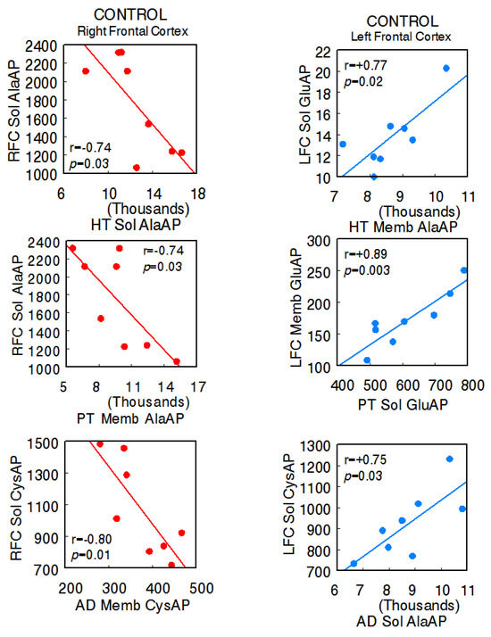 Significant inter-tissue positive or negative correlations obtained between specific soluble (Sol) or membrane-bound (Memb) alanyl-(AlaAP), cystinyl-(CysAP), or glutamyl-(GluAP) aminopeptidase activities, expressed as pmol/min/mg prot, of the left or right frontal cortex versus the same enzymatic activities obtained in the hypothalamus (HT), pituitary (PT), or adrenals (AD) in the control spontaneously hypertensive rats (SHR) (n = 8). Negative values are shown in red, while positive values are shown in blue. Pearson’s correlation coefficients (r) and p values are indicated in each figure.