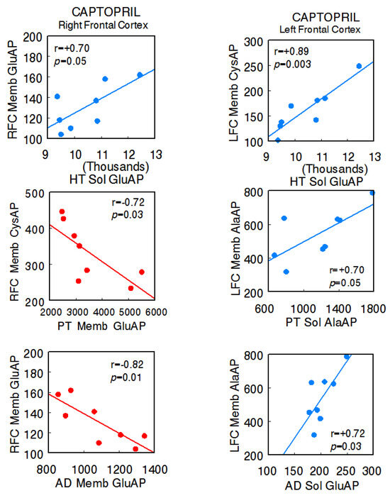 Significant inter-tissue positive or negative correlations obtained between specific soluble (Sol) or membrane-bound (Memb) alanyl-(AlaAP), cystinyl-(CysAP), or glutamyl-(GluAP) aminopeptidase activities, expressed as pmol/min/mg prot, of the left or right frontal cortex versus the same enzymatic activities obtained in the hypothalamus (HT), pituitary (PT), or adrenals (AD) in the captopril-treated spontaneously hypertensive rats (SHR) (n = 8). Negative values are shown in red, while positive values are shown in blue. Pearson’s correlation coefficients (r) and p values are indicated in each figure.