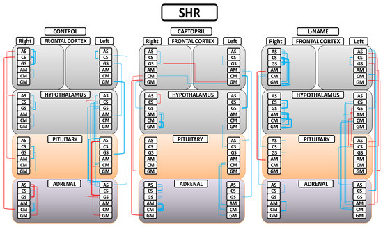 Significant intra- and inter-tissue correlations between angiotensinase activities of right and left frontal cortices, hypothalamus, pituitary, and adrenal gland in the control spontaneously hypertensive rats (SHR), the SHR treated with captopril, and the SHR treated with L-NG-Nitroarginine Methyl Ester (L-NAME). Blue lines—positive significant correlations; red lines—significant negative correlations; line thickness—degree of significance (this figure corresponds to the values indicated in Tables S1A,B–S3A,B). Soluble (AS) or membrane-bound alanyl aminopeptidase (AM), soluble (CS) or membrane-bound cystinyl aminopeptidase (CM) and soluble (GS) or membrane bound glutamyl aminopeptidase (GM). (Supplementary Tables S1A,B–S3A,B).