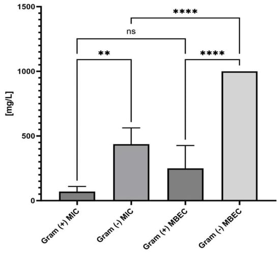 Comparison of MIC and MBEC values of analyzed compound towards all Gram (+) vs. Gram (−) bacteria. Asterisks show statistical significance, while “ns” denotes lack of statistical significance. The asterisks are intended to flag levels of significance. ANOVA with Tukey’s multiple comparison test (p = 0.05).