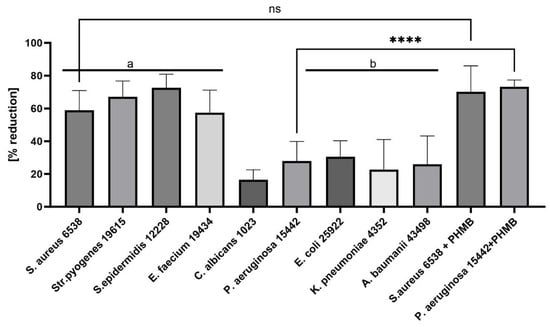 Comparison of ability of 500 mg/L ED compound to reduce biofilm [%] in the cellulose-based biofilm model (CBB). The asterisks or “ns” show statistical significance or insignificance, respectively, between level of reduction displayed by ED compound or standard PHMB antiseptic towards S. aureus and P. aeruginosa biofilm. The letters a/b show statistical significance in reduction between Gram+ and Gram− pathogens, while ns/**** shows lack or significant difference between reduction in biofilm performed by ED vs. PHMB, respectively. The asterisks are intended to flag levels of significance. ANOVA with Tukey’s multiple comparison test (p = 0.05).