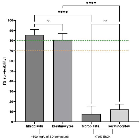 The survivability of fibroblast and keratinocytes cells exposed on the 500 mg/L of ED compound or 70% ethanol (usability control of experiment). The green dotted line indicates level of none or negligible cytotoxicity, while the orange dotted line indicates level of low/moderate cytotoxicity. Asterisks show statistical significance, while “ns” denotes lack of statistical significance. ANOVA with Tukey’s multiple comparison test (p = 0.05).