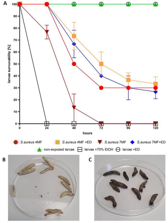 (A) The survivability [%] of larvae in the following hours (0–120) after exposure on the 500 mg/L of ED compound, or 70% ethanol (experiment usability control), or the PBS buffer (non-exposed larvae, control of growth). The infection model consisted of larvae injected with 4 or 7 McFarland (4 or 7MF, respectively) of S. aureus together with 500 mg of ED compound. The larvae injected with 4 or 7 MF of S. aureus only (without ED compound) served as the proof of this specific staphylococcal strain’s ability to kill larvae within time of experiment. (B) Live, creamy, motile larvae. (C) Dead, flaccid, motionless larvae.