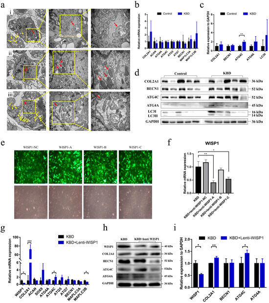 Previous literature indicated that WISP1 can play a role in renal fibrosis through the autophagy pathway [15]. The relationship between WISP1 and the autophagy pathway was detected in this study. Firstly, we used cultured KBD chondrocytes to observe the ultrastructure changes under the TEM. Multiple changes were found in KBD chondrocytes, including the distorted nuclei, the swelling mitochondria, the expanded endoplasmic reticulum, and a great number of liposomes (Figure 2a). Moreover, the autolysosomes were found in the KBD chondrocytes (Figure 2a(i)), suggesting a potential participation of defective autophagy in the development of KBD, which had also been identified by other studies [9,10].