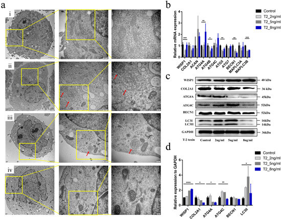Effects of T-2 toxin intervention in C28/I2 human chondrocytes. (a) The TEM results of C28/I2 human chondrocytes. (a(i)) The mitochondria in control C28/I2 human chondrocytes; (a(ii)) The autolysosome (red arrows) in C28/I2 chondrocytes treated with T-2 toxin (2 ng/mL); (a(iii)) The autolysosome (red arrows) in C28/I2 chondrocytes treated with T-2 toxin (5 ng/mL); (a(iv)) The mitochondria in C28/I2 chondrocytes treated with T-2 toxin (8 ng/mL). The scale bars are 2 μm, 500 nm, and 200 nm, respectively, from left to right. (b) The mRNA expression of target genes in C28/I2 intervened by T-2 toxin. (c) The protein expression of target markers in C28/I2 intervened by T-2 toxin. (d) The results of Western blots in C28/I2 intervened by T-2 toxin. * p < 0.05, ** p < 0.01, *** p < 0.001, **** p < 0.0001.