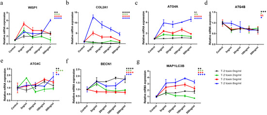 Moreover, the combined effect of the rWISP1 protein and T-2 toxin on C28/I2 was also explored (Figure 4). According to the results, the mRNA expression of WISP1 altered markedly under the rWISP1 protein treatment and had distinct trends in the three groups of T-2 toxin treatment (Figure 4a). The mRNA expression of ATG4C was also different in the three groups (Figure 4e). COL2A1 and ATG4A mRNA expression (Figure 4b,c) were significantly overexpressed and positively correlated to the increase in T-2 toxin concentration. In addition, ATG4B mRNA expression showed an overall downtrend in the three groups (Figure 4d). For BECN1 (Figure 4f) and MAP1LC3B (Figure 4g), a significant rise was observed in the three groups, suggesting a potential change in autophagy with an increasing concentration of T-2 toxin.